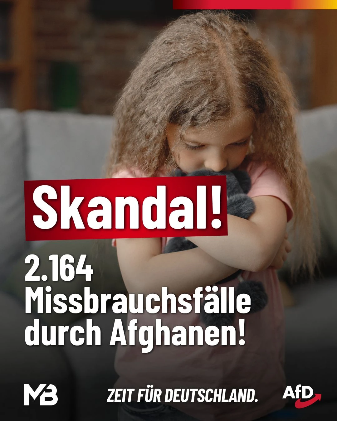 2015 öffnete Merkel die Grenzen – 10 Jahre später zeigen sich die grausamen Folgen: 2.164 Kinder wurden laut Bundesregierung zwischen 2016 und 2023 von Afghanen sexuell missbraucht. Schon 2016 explodierten die Zahlen: 280 Fälle, ein Anstieg um über 600 % im Vergleich zu 2014. Die Altparteien schweigen, die CDU verteidigt ihre „Wir schaffen das“-Ideologie – und unsere Kinder zahlen den Preis. Die Bundesregierung wiegelt ab, will keine Zusammenhänge untersuchen. Nur durch eine Anfrage der AfD kam dieses erschütternde Ausmaß ans Licht. Jetzt ist klar: Diese Politik schützt nicht – sie gefährdet. Es braucht sichere Grenzen, klare Konsequenzen und ein Ende der ideologischen Verharmlosung.